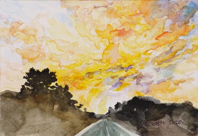 여름의 끝자락, 차창 밖으로 스쳐 지나가던 노을의 순간을 한 장면으로 붙잡은 풍경이다. 화면 아래에서 위로 길게 뻗은 도로는 아직 식지 않은 낮의 열기를 품은 채, 어딘가로 계속 이어진다. 좌우로 펼쳐진 어두운 수풀은 하루를 마무리하는 그림자처럼 단단하게 자리 잡고, 그 위로는 해가 지며 남긴 빛의 층이 하늘 가득 번져 오른다. 노랑과 오렌지, 연분홍이 뒤섞인 하늘의 물감 자국은 점과 선 대신 넓게 번진 얼룩과 흐름으로 표현되어 있다. 서로 겹치고 스며든 색의 결은 구름의 형태를 빌려, 뜨겁게 타오르다 서서히 식어 가는 여름 저녁의 공기를 전한다. 곳곳에 스민 보라와 회색의 기운은 곧 다가올 밤을 예고하며, 노을빛과 부딪히며 미묘한 긴장을 만든다. 여행길에서 마주친 이런 노을은 풍경을 보는 눈뿐 아니라 마음의 방향도 잠시 멈추게 한다. 앞으로 나아가는 도로의 선과 하늘에서 사방으로 퍼져 나가는 빛의 흐름이 교차하면서, 관람자는 자신이 어디쯤 서 있는지, 어느 계절과 어느 시간대를 지나고 있는지 조용히 되묻게 된다. 잠시 눈을 들어 이 하늘을 올려다보는 순간, 노을 속으로 빨려 들어가듯 여름의 온기와 저녁 공기의 냄새가 함께 떠오르게 된다. ※ 그림 그리는 과정 영상 링크: https://www.youtube.com/watch?v=Hm5u_O2Tc7U&list=PLvLQ7XCwp3RWUOFluhebG859lFPhKsKDN&index=24