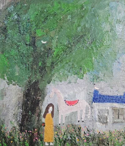 「달의 정원」은 감정과 무의식, 그리고 치유의 세계를 탐구하는 회화로 단순한 풍경화나 판타지적 이미지가 아닌, 현대인의 감정 깊숙한 곳, 언어로는 표현할 수 없는 내면의 층위를 달빛이라는 상징을 통해 드러내는 정서적 서사이자 치유적 공간이다. 작가는 여행 중 마주한 ‘달배’에서 영감을 받아 이 작업을 시작하였다. 현실에서 벗어나고 싶은 욕망, 조용한 내면의 시간, 자신만의 감정적 피난처를 찾고자 하는 갈망은 「달의 정원」이라는 시리즈 안에서 몽환적 이미지와 서정적 분위기로 시각화었다. 여기서 ‘달’은 단지 풍경의 배경이 아니라, 감정의 거울이자 무의식의 안내자로 감정을 비추며, 내면의 어둠을 조용히 끌어안는 매개체이다. ‘정원’은 이 달빛 아래 펼쳐진 상징적인 상상의 공간이다. 자연은 인간 내면의 확장이자 감정의 비유로 사용되며, 특히 정원은 마음의 안식처이자 자아의 심연을 드러내는 무대가 된다. 이곳의 소녀와 동물들은 현실의 인물이 아닌 다양한 감정의 은유, 혹은 ‘자아의 분신’이라 할 수 있다. 그들은 우리의 상처와 고독, 그럼에도 불구하고 존재하는 희망을 상징한다. 「달의 정원」은 미학적으로도 독창적인 지점을 형성하고 있는데 서양화 재료를 사용하고 있지만, 동양화의 여백, 감정의 흐름, 상징적 내러티브를 적극적으로 끌어들이며 동양적 서정성과 현대적 조형미의 융합을 보여주고 있다. 김명진작가는 화면의 강렬한 구성을 의도적으로 피하고, 감정을 수면 아래에 잠기듯 표현하고자 했다. 이를 위에 화면안의 캐릭터의 존재도 크지 않고 앞모습이 아닌 뒷모습으로 표현하여 관람자로 하여금 시각적 인식 너머의 ‘느낌’을 감지하게 하며, 회화가 감각이 아닌 감정으로 읽히도록 유도하고자 하였다. 작품의 색채 또한 작품에서 중요한 감정 언어로 컬러 테라피적인 효과를 통해 감정적 위안을 제공하며 단순히 색의 조화가 아니라, 감정의 흐름을 시각화한 회화적 언어로 기능하고 있다. 무엇보다 주목해야 할 점은, 「달의 정원」이 동시대 사회가 안고 있는 감정적 문제와 심리적 피로감에 대한 예술적 해법을 제시한다는 점이다. 빠르게 변화하는 기술 환경과 불확실한 사회 구조 속에서, 많은 이들은 고립, 불안, 정체성의 혼란을 경험하고 있다. 김명진의 작품은 이러한 내면의 균열과 상처를 조용히 바라보고, 포근하게 감싸주는 시각적 공간을 제공함으로 정서적 환기와 사유를 유도하고자 했다. 이로써 , 「달의 정원」 이 단지 감상의 대상으로 머무는 것이 아니라, 현대인의 감정 회복과 내면적 안정에 기여하는 예술적 치유의 장으로 만들고자 했다. 궁극적으로 「달의 정원」은 관람자에게 ‘심리적 쉼표’를 제공하는 회화라 할 수 있다. 그것은 현실에서 지친 감정을 조용히 어루만지고, 자기 자신과의 깊은 대화를 이끌어내는 공간이다. 김명진은 이 작업을 통해 현대인이 쉽게 드러내지 못하는 감정의 언어를 대신 회화로 풀어내며, 감정의 쉼터이자 시적 상상력의 장으로 관람자를 초대한다. 이 시리즈는 단지 개인의 상상에서 시작된 것이 아니라, 동시대를 살아가는 우리 모두가 겪는 내면의 무게와 고요한 갈망을 섬세하게 시각화한 공동의 정서적 풍경이다. 김명진의 「달의 정원」은 미적 경험을 넘어, 감정의 치유, 삶의 성찰, 그리고 정체성 회복을 위한 시각적 명상으로 기능하며, 오늘날의 예술이 감정과 삶을 회복하는 새로운 방식의 시각적언어라 할 수 있다.