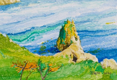 푸른 물결이 겹겹이 밀려오는 화면 위로, 소매물도의 바위섬이 하나의 생명체처럼 솟아 있다. 가까이에서 바라본 해안 절벽은 노랑과 갈색, 초록이 뒤섞인 짧은 붓질로 쌓여, 오랜 시간 파도와 바람을 견뎌 온 몸의 결을 드러낸다. 바위 위로 번져 오른 초록빛 수풀은 거친 암석을 감싸 안듯 자라며, 섬이 단단한 돌덩이이면서도 동시에 살아 숨 쉬는 존재임을 말해 준다. 수평선 대신 화면을 가득 채운 바다는 여러 겹의 푸른 띠로 표현되어 있다. 옅은 하늘색, 짙은 코발트, 에메랄드가 짧고 반복적인 획으로 이어지며, 실제 파도 소리 대신 색과 리듬으로 출렁임을 전한다. 물감이 스며들며 남긴 번짐과 겹침은 물결이 서로 부딪히고 스쳐 가는 순간들을 포착한 흔적처럼 남아, 바다가 단순한 배경이 아니라 기억과 감정이 흘러가는 장으로 느껴지게 한다. 앞쪽의 초록 언덕은 부드러운 곡선을 따라 아래에서 위로 열리며 관람자의 시선을 섬과 바다 쪽으로 이끈다. 언덕 위에 놓인 나무들은 붉고 주황빛 잎을 달고 있어, 바다의 차가운 푸른색과 대비를 이루며 계절의 온기를 더한다. 작은 화면 안에서 점과 선, 짧은 호흡의 붓질이 끊임없이 이어지며, 여행길에서 맞닥뜨린 한 순간의 풍경이 시간의 흐름과 마음의 리듬을 품은 장면으로 다시 떠오른다. 이 작품 앞에 서면, 관람자는 절벽 끝에 함께 서서 아래로 펼쳐진 바다를 내려다보는 듯한 위치에 놓인다. 바람의 방향을 따라 물결이 기울고, 햇빛이 스쳐 지나간 자리마다 다른 색의 파장이 번져 나간다. 잠시 시선을 머무르면, 소매물도라는 구체적인 장소를 넘어, 각자의 기억 속 바다와 여행의 순간들이 조용히 겹쳐 올라오는 경험을 만나게 된다. ※ 그림 그리는 과정 영상 링크: https://www.youtube.com/watch?v=DZEbgWDQKRk&list=PLvLQ7XCwp3RWUOFluhebG859lFPhKsKDN&index=15