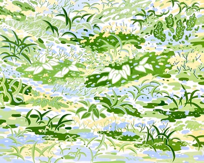 옅은 라임, 아이보리, 연한 블루가 뒤섞인 화면 위로 풀잎과 잎사귀들이 파편처럼 흩어져 있다. 얼어 있던 흙이 막 풀리기 시작한 계절처럼, 차가운 기운이 남아 있지만 색은 이미 봄을 향해 기울어 있다. 포근한 크림빛과 맑은 하늘색이 군데군데 번지며, 초록의 덩어리들을 감싸 안는다. 실제로는 흙, 물, 풀, 그림자일 법한 것들이 모두 비슷한 크기의 색면으로 나뉘어, 하나의 반복되는 패턴처럼 리듬을 만든다. 가까이에서 보면 각각의 풀잎은 단순한 선과 면으로 환원되어 있다. 잎맥 대신 한 번의 곡선, 풀숲 대신 짧은 획들의 집합이 놓여 있을 뿐이다. 그러나 화면을 조금 멀리서 바라보는 순간, 이 추상적인 조각들은 ‘정원’이라는 익숙한 이미지로 재조합된다. 눈은 자연스럽게 길처럼 보이는 밝은 띠를 따라가고, 그 주변으로 번지는 초록의 군락을 작은 풀밭과 관목으로 읽어낸다. 실제 풍경이라기보다, 여러 계절의 잔상이 겹쳐진 하나의 정원 구조에 가깝다. 이 작품에서 흥미로운 지점은, 자연을 구성하는 구체적인 요소보다 ‘자연처럼 느껴지게 하는 패턴’이 더 앞에 서 있다는 점이다. 동일한 크기의 색점, 일정한 간격의 풀잎, 반복되는 곡선들이 모여, 우리가 도심 속 공원과 조성된 정원에서 익숙하게 마주하는 장면을 떠올리게 만든다. 화면이 주는 편안함과 안정감은 실제 자연의 거칠고 예측 불가능한 리듬이라기보다, 이미 여러 번 경험하고 학습해온 정돈된 자연의 이미지에서 온 것인지도 모른다. ‘겨울의 끝에서 추운 봄 기운’이라는 제목처럼, 이 정원은 아직 완전히 따뜻해지지 않은 계절의 중간 지점에 머물러 있다. 차가운 블루와 부드러운 옐로, 그리고 선명한 그린이 서로를 밀어내지 않고 얇게 포개지며, 막 피어오르려는 생기의 기운을 조용히 예고한다. 화면 앞에 서서 이 패턴의 숲을 따라가다 보면, 지금 내가 보고 있는 것이 실제 자연의 기억인지, 도시에서 반복적으로 마주친 정원의 이미지인지, 스스로에게 한 번쯤 물어보게 된다. 그 질문을 품은 채 천천히 시선을 거둘 때, 작품 속 풀바다는 관람자의 안쪽에 각자가 가진 또 다른 ‘도심의 정원’을 함께 겹쳐 놓는다.