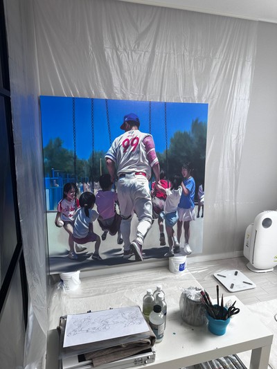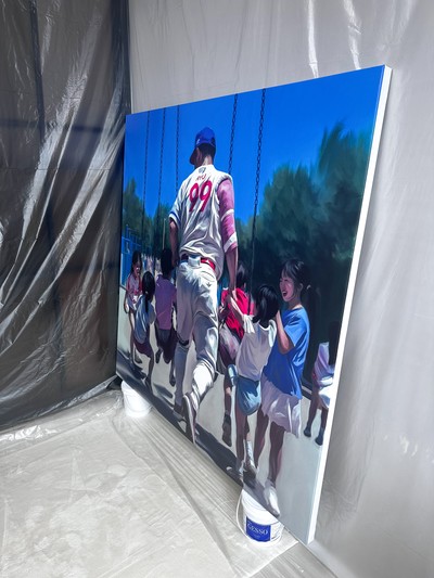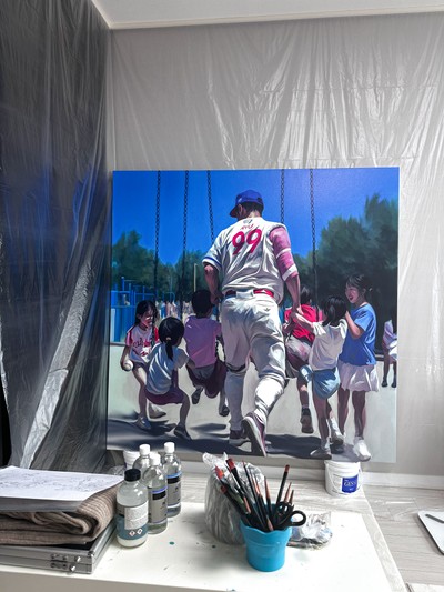 <Mon-Star> Mon-은 Mono-, 즉, '하나의, 단일의' 등의 뜻을 가지고 있다. '단 한 명의 스타'로 번역되는 본 작품명은 류현진 선수의 별명인 몬스터(Monster)와 동음이의어이기도 하다. 작가가 '몬스터'라는 키워드를 선택한 이유는, 작가의 그림 스타일이 큐비즘적인 요소들을 섞기 때문에 인물을 마치 괴물처럼 보이게 표현해서이기도 하지만, 더 큰 이유는 작가에게 있어서 류현진 선수에 대한 첫 기억이 '괴물' 그 자체였기 때문이다. 작가가 프로야구를 처음 보기 시작한 해에 응원하던 팀의 상대 선발투수로 만난 류현진 선수는 말 그대로 '괴물'이었고, 류현진 선수를 만나는 날에는 경기 시작 전부터 졌다고 생각하고 경기를 봤던 기억이 난다. 그 해 말도 안되는 기록을 쓰면서 '트리플크라운'을 달성하기에 이른다. 이후, 류현진 선수는 김광현, 양현종 선수와 함께 국대 좌완 3인방, 또 LA다저스에서는 클레이튼 커쇼, 잭 그레인키 선수와 함께 리그 최고의 공포 선발 3인방을 책임졌던 기억이 난다. 개인적으로는 각 3인방 중에서도 단연 돋보였고, 독보적인 스타이자, 선수였다. Mon-Star이자 Monster에 가장 잘 어울리는 선수였던 것이다. 그러한 점에 착안하고 영감을 받아 작가는 본 작품을 그리기 시작하였고, 각 분야의 수많은 재능들, 이를테면 류현진 선수 최애 작품인 '타짜'의 '고니(화투의 괴물)'나 '야인시대'의 '김두한(싸움의 괴물)'등과 견주어도 대한민국의 대표 몬스터인 '류현진' 선수를 표현한 작품이 'Mon-Star'이다. #류현진 #류현진재단 #류현진선수 #루도 #류니버셜2025 #류현진전시