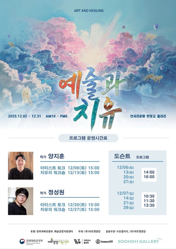 *지난 전시들 올려봅니다 :) * <예술과 치유> 흐르는 감각: 예술과 치유의 회복 예술은 현재를 살아가는 우리들이 인간과 사회,환경과 생태적 위기속에서, 우리와 자연, 개인과 공동체, 감정과 사유, 물질과 영성의 관계회복을 통해 치유적 의미 또한 수행하고 있습니다. "우리의 병은 우리가 살아가는 삶의 방식에서 비롯된다." -수전 손택, <은유로서의 질병> 수전 손택이 질병에 대한 은유적 사고를 비판했듯, 우리는 현대 사회가 감각을 마비시키는 현상을 일종의 병으로 진단하고자 합니다. 이번 전시는 바로 이 멈춰버린 감각의 흐름을 되찾는 여정에서 시작됩니다. 치유는 단순히 병이 사라지는 것에 국한되지 않습니다. 그것은 느끼지 못한 채 흘려보낸 시간, 무심코 지나친 감정, 표현되지 못한 언어들을 복원하는 과정일지도 모릅니다. 우리는 이 회복의 과정을 예술을 통해 발견합니다. 잊었던 감각이 조용히 깨어나고, 이미지가 내면의 감정을 일렁이며, 말보다 깊은 층위에서 우리를 감싸 안는 침묵. 이번 전시는 감각의 회복을 위한 사적인 여정에 여러분을 초대합니다. "예술은 억압된 감각과 언어를 회복하는 탈주의 경로이다." 철학자 질 들뢰즈와 펠릭스 가타리는 현대 사회가 개인의 감각과 언어를 획일화한다고 했습니다. 기능과 효율이 우선시되는 삶속에서 우리는 '느끼는 능력" 자체를 잃어가고 있습니다. 이러한 세계에서 예술은 일말의 언어, 새로운 사유의 가능성, 익숙함을 해체하는 탈주의 힘으로 존재합니다. 예술은 헌실로부터 도피하는 길이 아니라, 다시 삶을 감각하는 방식을 제안합니다. 요셉 보이스는 "모든 사람은 예술가다"라고 선언하며, 예술을 사회적 실천의 장으로 확장했습니다. 이번 전시는 그 정신을 작고 섬세한 방식으로 관람자와 공유합니다. 거대한 사회적 변화가 아니라, 개개인의 내면에서 일어나는 미세한 감각의 회복이야말로 가장 근원적인 예술적 실천이라는 믿음 아래, 전시장은 감각의 흐름 속으로 열려 있습니다. 작품들은 직접적으로 말하지 않습니다. 그러나 시선이 머무는 결, 여백과 색채, 물성과 흔들림 속에서 관람객은 자신만의 언어로 해석하고 반응하게 됩니다. 전시장은 정해진 정답이 없는, 감각이 다시 미세하게 진동하는 사유의 밀도 속으로 스며드는 공간입니다. 작품을 마주하는 여러분의 시간만큼, 예술은 의미를 생성합니다. 이에 '예술과 치유' 전시는 상처를 치유하는 정답을 제시하지 않습니다. 다만, 감각의 흐름 속에 작은 질문 하나를 띄웁니다. 그것은 마치 물속에서 조용히 퍼져가는 울림처럼, 각자의 마음에 닿기를 바랍니다. 예술이 우리를 어디까지 이끌 수 있는지 묻는 이 여정에, 여러분도 동행하시길 바랍니다. 🔸️전시기간: 2025.12.02(화)-12.31(수) 🔸️전시장소: 광양 인서리공원 반창고 갤러리 (전남 광양시 광양읍 남문길 65) 🔸️문의: 031-713-0287 🔸️후원: 문화체육관광부, 예술경영지원센터 🔸️주최: (주)아트앤광양 🔸️공동주관: 수호갤러리, (주)아트앤광양