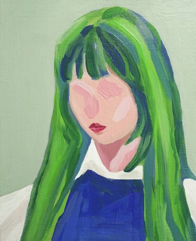 정사각형에 가까운 화면 안에 한 인물이 상반신만으로 크게 자리한다. 옆으로 살짝 기울어진 고개와 반쯤 내려다본 듯한 각도 때문에, 정면을 마주하고 있음에도 시선은 우리를 비껴가는 것처럼 느껴진다. 눈과 코는 선이나 점으로 명확히 그려지지 않고, 분홍빛 면들이 겹쳐진 볼륨만이 얼굴의 위치를 암시한다. 표정이 지워진 자리에서, 미세하게 다문 입술과 턱의 각도, 목의 기울기가 대신 이 인물의 상태를 말해 준다. 가장 먼저 눈을 끄는 것은 머리카락이다. 여러 톤의 선명한 초록과 짙은 파랑이 두꺼운 붓질로 켜켜이 쌓이며, 화면 위로 길게 흘러내린다. 수직에 가까운 이 긴 곡선들은 실제 머리카락의 결을 넘어, 위에서 아래로 조용히 떨어지는 생각의 흐름처럼 보인다. 중간중간 섞인 짙은 남색의 덩어리는 그 안쪽에 응축된 그림자이자, 밝은 초록의 표면 아래 숨은 감정을 암시하는 층처럼 남는다. 배경은 연한 회녹색의 평평한 색면으로 채워져 있다. 복잡한 기호나 사물은 등장하지 않고, 균질한 이 색이 인물 주변을 둘러싸며 부드러운 정적을 만든다. 그 위에서 흰 셔츠의 날카로운 칼라와 짙은 파란색 상의는, 단순한 기하학적 면으로 정리되어 가슴과 어깨를 단단히 받친다. 차가운 파란색과 따뜻한 피부색, 그리고 강렬한 초록 머리카락 사이의 대비는, 한 화면 안에서 서로 다른 온도의 감정이 맞닿아 있는 듯한 긴장을 만든다. 아크릴의 두꺼운 터치는 모든 요소를 세밀한 묘사 대신 색의 덩어리로 남겨 둔다. 개별적인 인물의 얼굴을 기억하게 하기보다, “누구인가”라는 질문을 비워 내고 “어떤 상태로 여기 서 있는가”에 시선을 머물게 한다. 관람자는 구체적인 눈동자를 찾는 대신, 입술의 방향과 목의 각도, 머리카락의 흐름을 따라가며 이 인물이 잠시 멈춰 선 순간의 온도에 다가가게 된다. 그렇게 화면 앞에 서 있는 시간 자체가 하나의 조용한 응시가 되어, 연한 배경과 초록의 머리카락 사이로 천천히 스며든다.