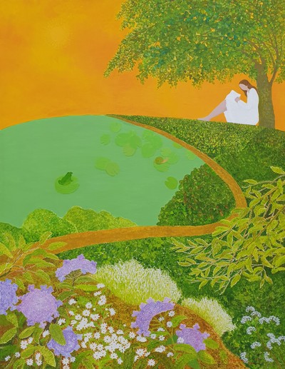 작품 설명 ㅡ 어느 여름밤, 하루를 소진한 후 찾아온 지친 마음의 이완, 그로부터 비롯된 ‘평화’의 감정을 기록한 내면 풍경이다. 작지만 깊고 커다란 내면의 평화로운 감정상태를 ‘향유고래’라는 살아있는 생명에 빗대어 표현했다. 뜨거운 열기가 채 식지않은 여름밤 특유의 습한 공기와 열대야의 정서는 현실과 비현실의 경계를 흐리게 했고 상상과 감각이 어우러진 동화 같은 내면 풍경이 펼쳐졌다. 실제하는 풍경의 시각적 재현을 넘어, 보이지 않는 계절감을 재료와 색채로 생생히 전달하고 싶었다. ㅡ Artist 아오