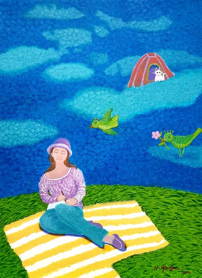 Acrylic on canvas_33.3x24.0cm_2022 자연은 나에게 영감의 원천이다. 동화적 상상력을 자극하고 새로운 세계를 꿈꾸게 한다. 캠핑을 즐겨했던 추억의 심상을 동화적 상상력으로 재미있게 표현한 작품.