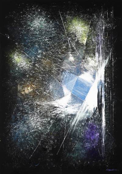 캔버스에 아크릴물감과 비즈, 금속. 2025. 15.8x22.7cm (1F) * 야광 그림이라서 밝은 곳에서 볼 수 있는 모습과 어두운 곳에서 보이는 모습이 하나에 담겨 있기에 위의 첨부 이미지 2장이 그림 한 점의 모습입니다. 제목: 치유하다 흘러내리는 고통은 이내 새하얀 치유의 흐름으로 치유된다. 바닥으로 떨어지던 고통의 흐름들은 어둠 속에서는 시간이 지나면서 곧게 자라나는 나무가 된다. 비바람을 이겨낸 나무가 더 단단하듯, 고통을 딛고 솟아난 나무는 더 단단하다. 물고기들은 이전의 시리즈에서도 그렇듯 사람들이다. 반짝이는 비즈를 붙였는데, 이것은 눈물방울이면서 동시에 삶이 맺은 열매이다. 그림 속의 작은 금속 링은 삶에서 지나온 어떤 약속의 흔적이기도 하다. 완전하지 않은 관계, 비워진 중심, 남아 있는 감정의 상징이다. 그것은 사랑이기도, 책임이기도, 혹은 단지 지워지지 않은 기억일 수도 있다. 이 작업은 지운다는 것이 아니라, 품는다는 것, 잊는다는 것이 아니라, 함께 살아간다는 것에 대한 이야기이다.