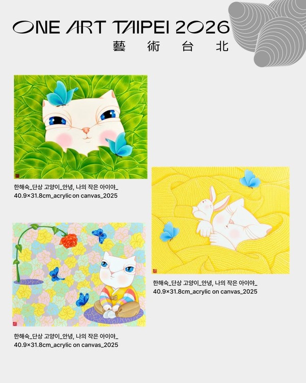 ✔️신불당아트센터 초대로 <ONE ART TAIPEI 2026>에 참가합니다. 많은 관심을 부탁드립니다. _ ▫️ <ONE ART TAIPEI 2026> ▫️기간: 2026.01.16~01.18 ▫️장소: Hotel Metropolitan Premier Taipei ▫️신불당아트센터 Room No. 1206호 ▫️초대작가: 공은지, 라영미, 안소연, 이정식, 정혜욱, 한해숙 _ #ONEARTTAIPEI2026 #ONEARTTAIPEI #신불당아트센터 #MGallery #대만아트페어 #Taipei #단상고양이 #한해숙