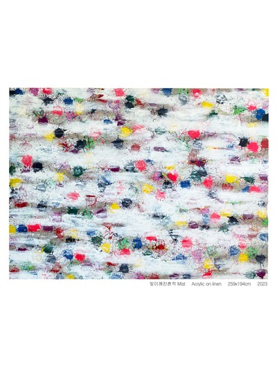 37.9x45.5cm (8F) 캔버스에 아크릴물감과 비즈 *야광 그림이라서 밝은 곳에서 볼 수 있는 모습과 어두운 곳에서 보이는 모습이 하나에 담겨 있기에 위의 첨부 이미지 2장이 그림 한 점의 모습입니다. 제목: 고통의 중첩, 그리고 희망 고통은 반복되기도 한다. 삶은 고통의 연속이라는 말이 있듯 인간에게 어쩌면 고통은 필연적이다. 고통은 그렇게 반복되며 쌓이게 되어 여러 겹으로 중첩된다. 그러면서 그 고통의 색은 더욱 진해지며, 그로 인한 염증과 트라우마 역시 더욱 커진다. 하지만 인간은 그럼에도 불구하고 희망을 잃지 않는다. 아스팔트 사이에서도 새싹이 피어나듯 중첩된 고통 속에서도 희망의 빛이 피어나며 고통의 색은 연해지며 중화된다. 빛과 어둠이 교차하는 순간마다 고통은 중첩되고 희망은 피어난다. 작품은 그러한 인간의 삶이고 숨결이다.