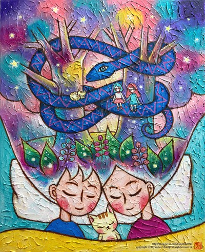 2019년 한국을 떠나 외국에서 3년간 지내는 동안 힘들고 외로운 순간들도 많았다. 그 시간을 버티게 해준 것은 멀리 있는 가족이었다. 내가 좋아하는 음식들, 필요한 물건으로 가득한 택배 상자를 받아볼 때면 곳곳에 묻어있는 가족들의 흔적에서 위안과 힘을 얻었다. 그리고 나 역시도 가족들을 위해 선물을 보내고는 했는데, 특히 어머니를 위해 선물을 준비하고 포장하며 어머니를 생각하던 시간들, 선물을 받고 행복해하시며 리본을 풀어보시던 어머니의 모습을 마음속에 깊이 간직하며 외로움을 버텨낼 수 있었다. 언젠가 그 기억들이 희미해질 수는 있겠지만, 내가 가족들로 받았던 사랑과 어머니와 가족들의 행복해하던 미소를 보았을 때 느꼈던 행복함은 영원히 기억되는 감정일 것 같다. 오래도록 간직될, 잊고 싶지 않은 감정을 리본에 담아 그려냈다. 예쁘게 묶여있는 선물상자의 리본을 풀어야 할 때, 아깝고 아쉽고, 이 모습을 망가트리기 싫어 주저해질 때가 있다. 나는 잘 매만져진 리본이, 소중한 순간, 잊고 싶지 않은 감정이라고 생각한다. 그림을 보는 분들에게도 사랑하는 사람을 위해 선물을 준비하던, 또는 선물을 받았던 소중한 기억이 분명 있을 것이다. 그 때의 마음을 떠올리며 작가가 작품에 담은 사랑 가득한 마음을 전달 받았으면 좋겠다.