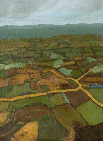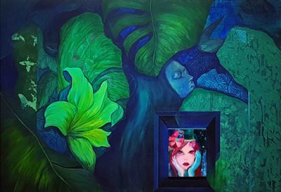 반복되는 둥근 형태들은 빗방울을 기다리며 조용히 숨을 고르는 우산처럼, 혹은 촘촘히 모여 있는 작은 항아리들처럼 보입니다. 초록과 청록, 흰색이 겹겹이 쌓이며 만들어내는 리듬은, 한 사람의 하루가 차곡차곡 쌓여 계절이 되고 시간이 되는 감각을 떠올리게 합니다. 그 사이를 가로지르는 짙은 파랑의 선들은 아직 떨어지지 않은 빗줄기이자, 곧 스며들 희망의 기호처럼 화면을 가볍게 흔듭니다. 아크릴 특유의 선명한 발색과 빠른 붓질로 만들어진 겹겹의 색면은, 젖은 땅 위에 고인 물웅덩이와 반짝이는 빛을 동시에 품고 있습니다. 가까이 다가가면 물감이 튄 자국과 미세한 흔들림들이 눈에 들어오는데, 이는 고요한 기다림 속에서도 계속해서 움직이고 변화하는 마음의 결을 닮아 있습니다. 이 작품은 비가 오기 전의 공기처럼 약간은 무겁지만, 곧 내릴 비를 예감하는 설렘을 함께 담고 있습니다. 화면을 바라보는 동안 관람자는 저 둥근 형태들 사이 어딘가에 자신만의 자리를 찾아 앉아, 곧 떨어질 첫 빗방울을 함께 기다려 보게 됩니다.
