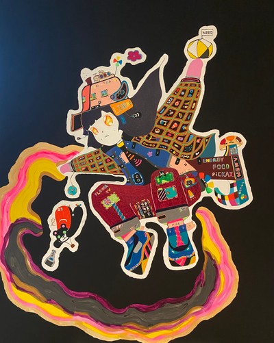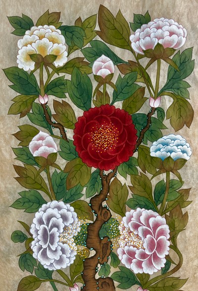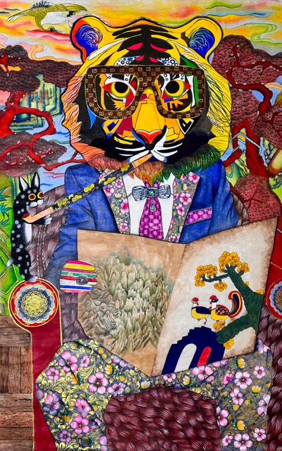 일묘봉인도<현대민화공모전입상작> 순지에 혼합재료 130*190 일묘봉인도는 민화의 형식을 재해석하여 현대적인 감각을 더한 작품이다. 중심에는 인간적인 감성을 지닌 호랑이가 자리 잡고 있으며 이는 전통적인 수호와 권위의 상징으로서의 호랑이를 현대적이고 개성적인 존재로 표현하고자 했다. 호랑이가 들고 있는 종이 왼편에는 조선 후기 김홍도의 금강산전도를 모티브로 하여 그린 풍경이 담겨 있다. 금강산의 웅장하고 신비로운 아름다움을 표현하며 자연과 전통에 대한 경외를 나타내고 있다. 또한 호랑이의 곁에서 담뱃대를 들고 시중드는 토끼는 전통 설화에서 영감을 받은 요소이다. 호랑이를 돕는 토끼의 모습은 강자와 약자 간의 독특한 관계를 유머러스하게 묘사하며 전통 설화에서 호랑이와 토끼가 지닌 상징성을 새롭게 해석했다. 토끼는 소박하면서도 영리한 존재로 그려졌으며 이는 민화 속 상징적 요소에 생동감을 부여하는 장치로 그려냈다. 배경 속 강렬한 색감의 하늘 화려한 패턴의 복장 그리고 세밀하게 묘사된 요소들은 전통적 소재와 현대적 표현 기법이 조화를 이루도록 의도하였다. 호랑이가 착용한 안경과 소품들은 전통을 현대적으로 재해석한 유머러스한 시각적 요소로, 관람자에게 친근감을 주고자 했다. This artwork is a modern reinterpretation of traditional Korean folk art, Minhwa. At its center is a tiger, a classic symbol of authority and protection, reimagined as a character with a unique and human-like charm. On the paper the tiger holds, the left side depicts a landscape inspired by Kim Hong-do’s Geumgangsan Jeondo (Panoramic View of Mount Geumgang) from the late Joseon Dynasty. This scene captures the grandeur and mystique of Mount Geumgang, expressing reverence for nature and traditional aesthetics. Beside the tiger is a rabbit holding its smoking pipe, assisting it in a whimsical act of servitude. This element draws inspiration from Korean folktales, humorously portraying the relationship between the powerful tiger and the clever rabbit. The rabbit, known for its wit and humility, adds a lively and playful touch to the composition. The vibrant colors, intricate patterns, and modern accessories, such as the tiger’s glasses, blend tradition with contemporary flair. These details are meant to create a unique harmony between the old and the new, inviting viewers to connect with the work on both an emotional and cultural level. Ultimately, this piece is not just a replication of the past but an exploration of traditional themes through a modern lens. It aims to showcase the openness and timelessness of Minhwa, bridging history and the present in a way that feels fresh and relevant. #민화 #동양화 #한국화 #수상작