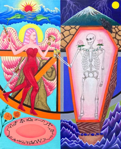 요지경 bizarre world <대한민국통일명인미술대전 특선작> 순지에 혼합재료 이작품은 작품의 중심에 강렬한 색감으로 표현된 호랑이와 까치가 자리 잡고 있습니다. 호랑이는 용맹과 권위를 상징하며, 까치는 길조와 소식을 전하는 존재로 여겨지는데, 두 요소는 민화에서 흔히 등장하는 조합으로 익숙하면서도 상징적인 의미를 지닙니다. 작품의 양옆에는 모래시계를 연상시키는 자개 패턴이 묘사되어 있습니다. 이 패턴은 시간이 흘러가는 과정을 나타내며, 과거와 현재, 그리고 미래를 연결하는 상징적 요소로 작용합니다. 자개의 빛나는 질감과 독특한 표현 기법은 전통적인 아름다움과 현대적 감각이 조화를 이루는 모습을 보여줍니다. 배경에는 다채로운 색채와 기하학적인 패턴이 어우러져 작품에 활기를 불어넣고, 각 요소들이 서로 연결되면서 이야기의 흐름을 형성합니다. 특히 기어와 꽃 같은 패턴은 현대적인 시간성과 자연의 조화를 강조하며, 과거에서 미래로 이어지는 시간을 이야기 속에서 시각적으로 구현하고자 한 의도를 담고 있습니다. This artwork places a tiger and a magpie, rendered in vivid and striking colors, at its center. The tiger symbolizes bravery and authority, while the magpie is regarded as a harbinger of good fortune and news. These elements, commonly seen in Korean folk paintings, are both familiar and deeply symbolic. On either side of the artwork, patterns reminiscent of hourglasses are depicted with mother-of-pearl designs. These patterns represent the passage of time, connecting the past, present, and future. The shimmering texture and unique expression of the mother-of-pearl convey a harmony between traditional beauty and modern sensibility. The background features a blend of vibrant colors and geometric patterns, infusing energy into the piece. The interconnected elements create a narrative flow throughout the artwork. Notably, patterns resembling gears and flowers highlight a harmony between modern concepts of time and nature, visually embodying the transition from the past to the future within the story. #민화 #한국화 #동양화 #수상작