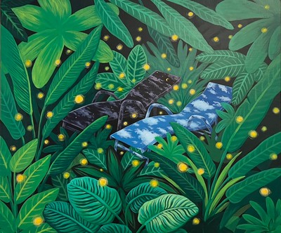 짙은 녹색의 잎들이 화면을 빽빽하게 채우고, 그 사이사이에서 노란 빛의 작은 구슬들이 떠다닌다. 풀벌레 소리 대신 빛이 울리는 것 같은 이 공간의 중심에는 두 개의 선베드가 놓여 있다. 하나는 낮의 하늘을, 다른 하나는 밤의 하늘을 품고 있어, 마치 서로 다른 시간대를...더보기