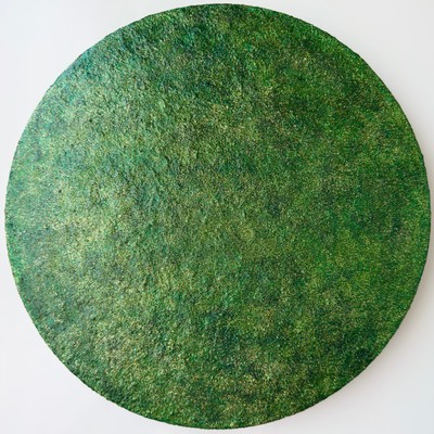 한눈에 들어오는 것은 하나의 거대한 초록 원이지만, 가까이 다가갈수록 화면은 이름 붙이기 어려운 숲의 표면으로 변한다. 재료가 두텁게 쌓인 나무 패널은 잎과 이끼, 젖은 흙을 동시에 떠올리게 하는 거친 피부를 만들고, 그 위를 덮은 초록과 금빛의 안료는 미세한 결을 따...더보기