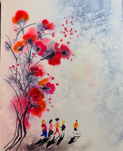 우드캔버스에 그린 수채 꽃추상화. 물의 번짐을 극대화하여 몽환적인 느낌을 표현한 작품