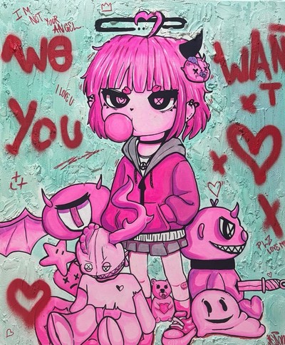 천사 타락 작전: 우리가 너를 원하는 이유는 2025.09.23 F20 Mixed media on Canvas 우리가 널 원하는 이유란 무엇일까. 소유욕일까, 성적 끌림일까. 우리는 그 모든 걸 ‘사랑’이라 부르기로 했다. 무심히 외면하는 너의 곁에서, 관심을 얻기 위해 우리는 너를 원한다. 달콤함 속에 감춰진 집착과 반항은 소녀와 귀여운 모습으로 유혹하는 악마들의 욕망, 그리고 칭찬과 조롱 사이를 넘나들며 무엇이 진짜일까?