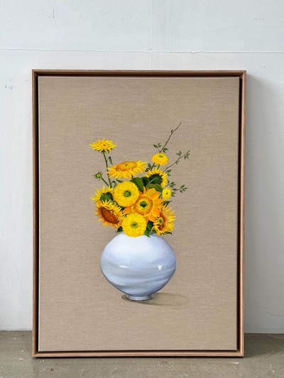 해바라기와 달 항아리 (Oil on Canvas) 이 작품은 유화(Oil Painting) 기법으로 완성된 원화(Original Painting) 입니다. 전통 달 항아리의 여백과 현대적 구도의 균형 속에서, 해바라기의 생동감과 따뜻한 빛을 담아냈습니다. 바탕 소재는 고급 아사 천(Premium Linen Canvas) 을 사용하였으며, 질감과 결을 그대로 살려 작가의 손끝 터치와 유화 특유의 깊이감이 잘 표현되어 있습니다. 본 작품은 단독 작품이 아닌, 식물·꽃·도자기 정물 회화로 이어지는 연작(Series Work) 중 하나로, 공간에 담백하면서도 존재감 있는 미감을 더해줍니다. 구매하신 모든 작품에는 작가 서명(Signature)과 작품 인증서(Certificate of Authenticity) 가 함께 제공됩니다.