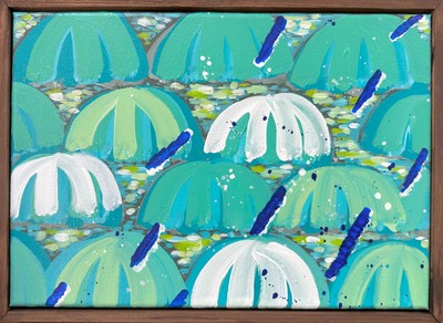 반복되는 둥근 형태들은 빗방울을 기다리며 조용히 숨을 고르는 우산처럼, 혹은 촘촘히 모여 있는 작은 항아리들처럼 보입니다. 초록과 청록, 흰색이 겹겹이 쌓이며 만들어내는 리듬은, 한 사람의 하루가 차곡차곡 쌓여 계절이 되고 시간이 되는 감각을 떠올리게 합니다. 그 사이...더보기