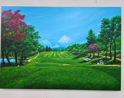 아크릴 특유의 선명한 색감으로 정갈하게 다듬어진 잔디 필드와 나무들, 그리고 소박한 피크닉 장면이 조화롭게 구성된 작품이다. 자연의 평온함과 일상의 여유가 동시에 느껴지는 화면으로, 맑고 투명한 날씨가 주는 개방감과 안정감을 강조한다.