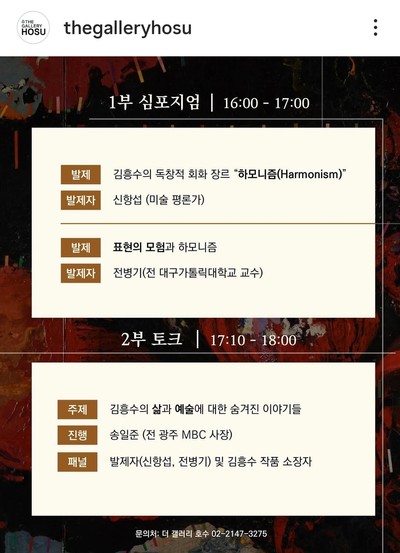 <김흥수: 하모니즘> 전시 관련 행사 공유합니다 :-) 더 갤러리 호수와 재단법인 한울은 《김흥수: 하모니즘》 전시와 연계하여 오는 10월 25일 심포지엄 <김흥수의 예술과 하모니즘>을 개최합니다. ...More