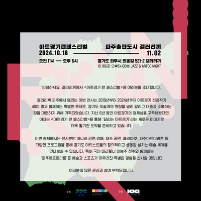❤️작년에 이어 올해도 함께 하게되었습니다.😄 초대해주신 갤러리끼에 감사의 말씀을 전합니다🙏 2024년 10월 18일부터 11월 2일까지 경기도•경기문화재단과 함께하는 《아트경기 런 페스티벌》이 갤러리끼 파주에서 개최됩니다. 《아트경기 런 페스티벌》은 2...더보기
