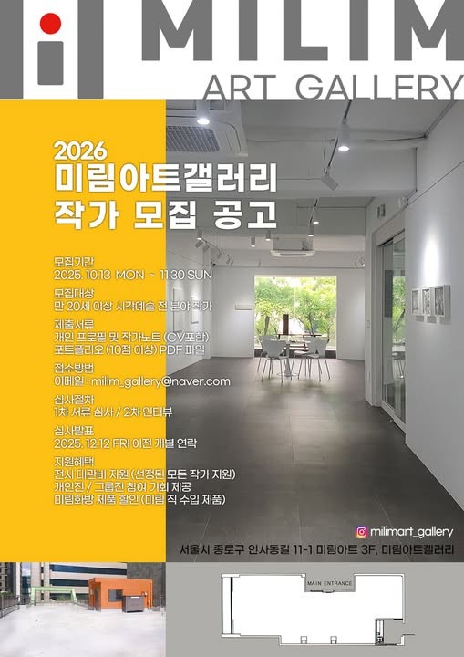 ๐ข์๊ฐ ๊ณต๋ชจ ์์ ๊ณต์ ๋๋ฆฝ๋๋ค. [2026 ๋ฏธ๋ฆผ์ํธ๊ฐค๋ฌ๋ฆฌ ์๊ฐ ๋ชจ์ง ๊ณต๊ณ ] ๐๋ชจ์ง ๊ธฐ๊ฐ 2025๋ 10์ 13์ผ(์) ~ 2025๋ 11์ 30์ผ(์ผ) ๐ ๋ชจ์ง ๋์ ์๊ฐ์์ ์ ๋ถ์ผ ๐ ์ ์ฒญ ์๊ฒฉ ๋ง 20์ธ ์ด์ ๊ธฐํ์ ๋ฐ ๊ทธ๋ฃน์ 1ํ ์ด์ ์ฐธ์ฌ ๊ฒฝํ์ด ์๋ ์๊ฐ ๐ ์ ์ถ ์๋ฅ ๊ฐ์ธ ํ๋กํ ๋ฐ ์๊ฐ๋ ธํธ (cv ํฌํจ) ํฌํธํด๋ฆฌ์ค (10์ ์ด์) ๋ชจ๋ ์๋ฅ๋ PDF ํ์ผ๋ก ์ ์ถ ๐ ์ ์ ๋ฐฉ๋ฒ ์ด๋ฉ์ผ ์ ์ : milim_gallery@naver.com ๐ ์ฌ์ฌ ์ ์ฐจ 1์ฐจ : ์๋ฅ ์ฌ์ฌ / 2์ฐจ : ์ธํฐ๋ทฐ ๐ ๋ฐํ 2025๋ 12์ 12์ผ(๊ธ) ์ด์ ๊ฐ๋ณ ์ฐ๋ฝ ๐ ์๊ฐ ์ง์ ํํ ์ ์ ๋๊ด๋น 100๋ง์ ๋ฒ์ธ ์ง์ (๋ฑ์ ์ฐจ๋ฑ ์์, ์ ์ ๋ ๋ชจ๋ ์๊ฐ ๋์ผ ์ง์) -1์ฃผ์ผ 200๋ง์ ์ค100๋ง์ ์ง์/10์ผ 250๋ง์ ์ค 100๋ง์ ์ง์ ๊ฐ์ธ์ ๋๋ ๊ทธ๋ฃน์ ์ฐธ์ฌ ๊ธฐํ ์ ๊ณต ๋ฏธ๋ฆผํ๋ฐฉ ์ ํ ํ ์ธ (๋ฏธ๋ฆผ ์ง์์ ์ ํ) - ๊ฐฌ๋ธ๋ฆฐ, ๋ค๋์์ค๋ฏธ์ค, ๋ผ์ค์ฝ, ๋ ์ค๋๋ฅด๋ฐ์ค์นด, ํ๋ ๋๋ฆญ์ค, ํ๋น์ฝ, ์ค๋ฉ๊ฐ, ๋ฎค์ฆ ๐ก ๋ฏธ๋ฆผ์ํธ๊ฐค๋ฌ๋ฆฌ์ ์ฝ์ ์ง๋ 1ํ ๊ณต๋ชจ์์ ํจ๊ปํ ์๊ฐ๋๋ค์ด ์ ์๋ฅผ ํตํด ์ฑ์ฅํ๋ ๋ชจ์ต์ ๋ณด๋ฉฐ, ํฐ ๊ฐ์ฌ์ ๊ฐ๋์ ๋๊ผ์ต๋๋ค. ์ด๋ฒ 2ํ ๊ณต๋ชจ์์๋ ๋ฏธ๋ฆผ์ํธ ๊ฐค๋ฌ๋ฆฌ๋ ์ ์ ๋ ์๊ฐ๋๋ค์ ๋ ๋ ํ ๋๋ฐ์๊ฐ ๋์ด, ๊ณต์ ํ ์ง์๊ณผ ์๋์๋ ์์์ ์ด์ด๊ฐ๊ฒ ์ต๋๋ค. ๋ฌธ์ : 010-2037-5168 (๋ฌธ์๋ง ๊ฐ๋ฅ)