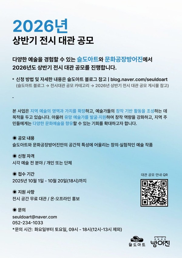 ๐ข์๊ฐ ๊ณต๋ชจ ์์ ๊ณต์ ๋๋ฆฝ๋๋ค. 2026๋ ์๋ฐ๊ธฐ ์ ์ ๋๊ด ๊ณต๋ชจ ๋ค์ํ ์์ ์ ๊ฒฝํํ ์ ์๋ ์ฌ๋์ํธ์ ๋ฌธํ๊ณต์ฅ๋ฐฉ์ด์ง์์ 2026๋ ๋ ์๋ฐ๊ธฐ ์ ์ ๋๊ด ๊ณต๋ชจ๋ฅผ ์งํํฉ๋๋ค. ๋ณธ ์ฌ์ ์ ์ง์ญ ์์ ์ ์์ญ๊ณผ ๊ฐ์น๋ฅผ ํ์ฅํ๊ณ , ์์ ๊ฐ๋ค์ ์ฐฝ์ ๊ธฐ๋ฐ ํ๋์ ์กฐ์ฑํ๋๋ฐ ๋ชฉ์ ์ ๋๊ณ ์์ต๋๋ค. ์์ธ๋ฌ ์ ๋ง ์์ ๊ฐ๋ฅผ ๋ฐ๊ตดยท์ง์ํ์ฌ ์ฐฝ์ ์ญ๋์ ๊ฐํํ๊ณ , ์ง์ญ ์ฃผ๋ฏผ๋ค์๊ฒ๋ ๋ค์ํ ๋ฌธํ์์ ์ ํฅ์ ํ ์ ์๋ ๊ธฐํ๋ฅผ ํ๋ํ๊ณ ์ ํฉ๋๋ค. โ ๊ณต๋ชจ ๋ด์ฉ ์ฌ๋์ํธ์ ๋ฌธํ๊ณต์ฅ๋ฐฉ์ด์ง๋ง์ ๊ณต๊ฐ์ ํน์ฑ์ ์ด์ธ๋ฆฌ๋ ์ฐฝ์ยท์คํ์ ์ธ ์์ ์ํ โ ์ ์ฒญ ์๊ฒฉ ์๊ฐ ์์ ์ ๋ถ์ผ / ๊ฐ์ธ ๋๋ ๋จ์ฒด โ ์ ์ ๊ธฐ๊ฐ 2025๋ 10์ 1์ผ - 10์ 20์ผ(18์)๊น์ง โ ์ง์ ์ฌํญ ์ ์ ๊ณต๊ฐ ๋ฌด๋ฃ ๋๊ด / ์จยท์คํ๋ผ์ธ ํ๋ณด โ ์๋ฅ ์ ์ถ ์ด๋ฉ์ผ seuldoart@naver.com โ ๋ฌธ์ seuldoart@naver.com 052-234-1033 * ๋ฌธ์ ์๊ฐ: ํ์์ผ-ํ ์์ผ, 09์-18์(12์-13์ ์ ์ธ)