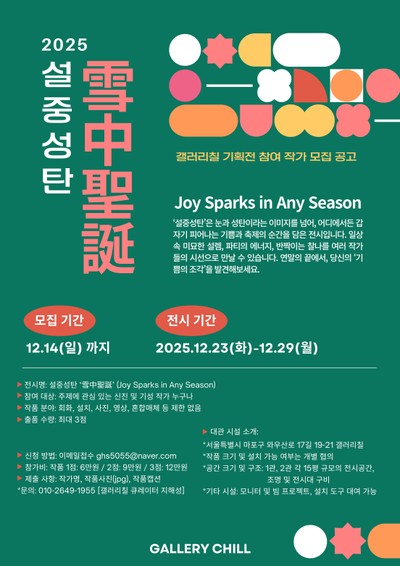 맞춤법 대신 쉼표 Comma, not a full stop 전시 작가모 집 공고 접수일정: 2025-11-17~2025-11-23 주관: 갤러리칠 주소: 서울특별시 마포구 와우산로17길 19-21 (서교동) 연락처: 010-2649-1955 이메일: ghs5055@naver.com 홈페이지: https://gallerychill.cafe24.com 전시 기간: 2025.12.02 ~ 12.08 • 전시 개요 한 해의 끝에서 우리는 종종 '마침표'를 찍으려 합니다. 하지만 때로는 완전히 멈추기보다, 잠시 호흡을 고르는 '쉼표'가 더 필요한 순간이 있습니다. 갤러리칠 기획전 '맞춤표 대신 쉼표'는 일상 속 잠깐의 멈춤, 느슨한 틈, 부 드러운 여유를 작품으로 담아내는 전시입니다. 과하지 않고, 화려하지 않아도 좋습니다. 조용한 밤의 온도나, 마음 한 귀퉁이의 작은 여백처럼 작가 자신의 호흡을 작품으로 기록해주시면 됩니다. • 출품 안내 참여 대상: 신진 및 기성 작가 누구나 출품 분야: 회화, 드로잉, 조소, 영상, 설치, 혼합매체 출품 수량: 최대 3점 작품 규격: 제한 없음 (대형 작품은 사전 협의) • 참가비 1개: 6만원 2개: 9만원 3개: 12만원 #갤러리칠 #gallerychill #맞춤법대신쉼표 #기획전작가공모 #기획전작가모집 #공모전작가모집 #작가모집 #전시기획전 #전시공모 #마포갤러리 #서울갤러리 #기획전 #작가모집 #서울전시 #마포전시 #가을전시 #겨울전시 #art #artist #artwork #전시모집 #미술전시 #아트공모 #artspace