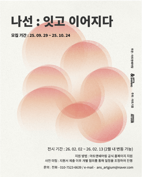 ๐ข์๊ฐ ๊ณต๋ชจ ์์ ๊ณต์ ๋๋ฆฝ๋๋ค. [Art&Sharing] 2026 ์ ์ <๋์ : ์๊ณ ์ด์ด์ง๋ค (*๊ฐ์ ) > ์๊ฐ ๊ณต๋ชจ <์ด์์ง ์๊ฐ - ์ํธ๊ธฐ์ ARTGIUM> ์ํธ๊ธฐ์์ โ์ฐ๋ฆฌ ์์ผ์์ ์์ธ๋ ์๋คThe Invisible์ ๊ฐ์ํํ๊ณ ๋ํ์ ์ฅ์ ๋ง๋ จํ์.โ๋ผ๋ ๋ชฉํ๋ฅผ ๊ฐ์ง๊ณ ๋งค๋ ๋ฏธ์ ์ ์๋ฅผ ๊ธฐํํ๋ฉฐ ๊ฐค๋ฌ๋ฆฌ ๊ณต๊ฐ ๋ด์์ ์ฌํ์ ์ฌ๊ฐ์ง๋๋ฅผ ์กฐ๋ช ํ๊ณ ์์ต๋๋ค. ์ํธ๊ธฐ์์ 2009๋ ๋ถํฐ ํ๋ํ๊ณ ์๋ ๋ฌธํ์์ ๋๋ ๋จ์ฒด โArt&Sharingโ์ ์๊ฐ์์ ํ์ ๋๋ค. Art&Sharing์ ์ง๊ธ๊น์ง 16๋ ๊ฐ 470์ฌ๋ช ์ ํ์์ด 110๊ฐ์ ํ๋ก์ ํธ๋ฅผ ํตํด ์ฌํ์ ๋ฉ์์ง๋ฅผ ์ ๋ฌํด์์ต๋๋ค. 2025๋ ํ๋ฐ๊ธฐ ์ํธ๊ธฐ์์ 19๋ช ์ ์ด์์ง์ด 5๊ฐ์ ํ์ ํ์ผ๋ก ๋ถ๋ฆฌ๋์ด ์ ์๋ฅผ ๋ง๋ค์ด๋๊ฐ ์์ ์ ๋๋ค. <์ ์ ์๊ฐ - ๋์ : ์๊ณ ์ด์ด์ง๋ค *๊ฐ์ > 2026๋ 2์, โ์กด(ๅญ)โ์ ์ฃผ์ ๋ก ์๊ฐ์์ ์ ๋ถ์ผ์ ์ํ์ ๊ณต๋ชจํ์ฌ ์ ์๋ฅผ ์งํํ ์์ ์ ๋๋ค. ์ ์ ์ฅ์๋ ํ์ฌ ๋๊ด ํ์ ํ์ ์์ผ๋ฉฐ, ์์ธ ๋ด ๊ณต๊ฐ์์ ์งํํฉ๋๋ค. ์ ์ ๊ธฐํ์ ๊ธฐ๋ฐ์ 2025๋ ์๋ฐ๊ธฐ Art&Sharing ํ์ ์ง์ ์ํธ๊ธฐ์ ํํธ์ด๋ฉฐ, ์ดํ ์ธ๋ถ ๊ธฐํ์ ์๊ฐ๋ถ๋ค๊ณผ ํจ๊ป ์ํตํด๋๊ฐ๋ฉฐ ์์ฑํ ์์ ์ ๋๋ค. ์ํธ๊ธฐ์์ ์ฃฝ์์ ๋ง์ฃผํ ์ด๋ค์ด ๊ฒช๋ โ๋จ๊ฒจ์งโ์ ์ ์์ ๋ด์๋ด๊ณ ์ ํฉ๋๋ค. ์ด๋ฒ ์ ์๋ ๊ฐ์ธ์ ๊ฒฝํ์ ๋์ด ์ฌํ์ ์ฐจ์์ผ๋ก ํ์ฅ๋๋ฉฐ, โ์ฐ๋ฆฌ๋ ์ฃฝ์์ ์ด๋ป๊ฒ ๊ธฐ์ตํ๊ณ ์์กดํ๊ฒ ํ ๊ฒ์ธ๊ฐโ๋ผ๋ ์ง๋ฌธ์ ๋์ง๋๋ค. ๋์๊ฐ ๊ด๋๊ฐ์ด ๋จ๊ฒจ์ง, ๊ธฐ์ต, ์์กด์ ๋ํด ์์ ๋กญ๊ฒ ์ฌ์ ํ๊ณ ๋๋ ์ ์๋ ๊ณต๋ก ์ฅ์ ๋ง๋ จํ๊ณ ์ ํฉ๋๋ค. ๊ทธ๋ฆผ, ์ฌ์ง, ์ค์น๋ฏธ์ ์ํ ๋ฑ ์๊ฐ์์ ์ ๋ถ์ผ์ ๋๋ถ์ด ๊ด๊ฐ๊ณผ ํจ๊ป ๋ง๋ค์ด๊ฐ๋ ๋๋ด ๋ฐ ๊ฐ์ฐ์ ์งํํ ์์ ์ ๋๋ค. ๋ณธ ์ ์๋ ๊ด๋๊ฐ์ด ์ ์์ ์ ๊ทน์ ์ผ๋ก ์ํตํ๊ณ ๊ฐ์ ํ๋ฉฐ, ์ฃฝ์์ ์ด๋ป๊ฒ ๊ธฐ์ตํ๊ณ ์์กดํ๊ฒ ํ ๊ฒ์ธ๊ฐ์ ๋ํด ํจ๊ป ์ฌ์ ํ๊ณ ๋ ผ์ํ๋ ๊ฒ์ ๋ชฉํ๋ก ํฉ๋๋ค. ํ์ ์ง์ ์ํธ์ค์์ด๋ง ๊ณต์ ํํ์ด์ง์์ PDF ํ์ผ๋ก ๋ค์ด๋ก๋ํ ์ ์์ต๋๋ค. <์ ์ ์งํ ๊ณผ์ > ์๊ฐ ๋ฐ ์ํ ๊ณต๋ชจ โ ์ ์ ๊ธฐํ ๋ฐ ์ฐ์ถ โ ์ํ ์ค์น โ ์ ์ ๋ฐ ์ฐ๊ณ ํ๋ก๊ทธ๋จ ์งํ โ ์ ์ ์ฒ ์ (*์๊ฐ๊ฐ ๋ณด์ ํ ๊ธฐ์กด ์ํ์ ์ถํ์ ์ฐ์ ์ผ๋ก ํ๋, ์ ์ ๊ธฐํ ์๋์ ๋ถํฉํ๋ ๊ฒฝ์ฐ ์ ๊ท ์ฐฝ์ ์ํ์ ์ถํ๋ ๊ฐ๋ฅํจ.) <์ ์ ํํ> - ์ฐํฉ์ ์ <์งํ ์ผ์ > - ์๊ฐ ๊ณต๋ชจ: 2025. 09. 29.(์) ~ 10. 24.(๊ธ) - ์ฌ์ ๋ฏธํ : ์ง์์ ์ ์ถ ์ดํ ๊ฐ๋ณ ํ์๋ฅผ ํตํด ์ผ์ ์ ์กฐ์ ํ์ฌ ์งํ - ์ ์ ๊ธฐ๊ฐ: 2026. 2. 2. ~ 2. 13. (2์ ๋ด ๋ณ๋ ๊ฐ๋ฅ) <์ง์ ์๊ฒฉ> - ํ๋ ์ด๋ ฅ, ์ฅ๋ฅด ์ ํ ์์ด ์๊ฐ์์ ์ ๋ถ์ผ ์ง์ ๊ฐ๋ฅ <์งํ ์ ์ฐจ> - ์ํธ์ค์์ด๋ง ๊ณต์ ํํ์ด์ง์์ ์ง์ (ํ๋จ ๋งํฌ ๋๋ ์ธ์คํ๊ทธ๋จ ํ๋กํ ๋งํฌ ์ฐธ๊ณ ) http://www.artnsharing.org/ - ํฌํธํด๋ฆฌ์ค ํ์ ์ ์ถ - ์ ์ ์ ๊ฐ๋ณ ์ฐ๋ฝ <ํํ> - ์จ๋ผ์ธ ํ๋ณด - ์ ์ ์ฐ๊ณ ํ๋ก๊ทธ๋จ ์ฐธ์ฌ - ์ํธ์ค์์ด๋ง ๋ด ํ๋ก์ ํธ ์๋ก - ์ ์ ๋๋ก ์ ์ - ์ด์ธ์ ์ธ๋ก ๋ณด๋, ์ค๋์ค ๋์จํธ ์ ์, ๋ด๋ถ ๊ฐ์ฐ/์คํฐ๋ ์ฐธ์ฌ ๋ฑ์ ํํ ๋ฑ ๋ด๋ถ ๋ ผ์ ์ค์ ์์. <์ฐ๋์ฌํญ> - ๋๋ฃ ์๊ฐ๋ค๊ณผ ํจ๊ป ๋จ์ฒด์ ์ ์ฐธ์ฌํ์ฌ ์ด๋ ฅ์ ์๊ณ ์ถ์ผ์ ๋ถ - ํน์ ๋งค์ฒด์ ๊ตญํ๋์ง ์๋ ํ๊ธฐ์ ์ธ ์ํ์ ์ฐฝ์ํ๊ณ ์ถ์ผ์ ๋ถ - ์ํ์ ํตํด ์ถ์ ๋ํ ์ง์ํ ์ด์ผ๊ธฐ๋ฅผ ๋๋๊ณ ์ถ์ผ์ ๋ถ - ์ ์ ์ฐธ์ฌ๋ฅผ ํตํด ๋จ๊ฒจ์ง, ์ฃฝ์, ์์กด์ ๋ํด ๊น์ด ์๊ฒ ์ฌ์ ํ๊ณ ์ถ์ผ์ ๋ถ <์๋ด์ฌํญ> - ์ ์ ๊ณผ์ ์์ ์๊ฐ ๋ถ๊ป ๋ณ๋๋ก ์๊ตฌ๋๋ ์ฐธ๊ฐ ๋น์ฉ์ ์์ต๋๋ค. - ์ํ ์ค์น์ ํด์ฒด๋ 