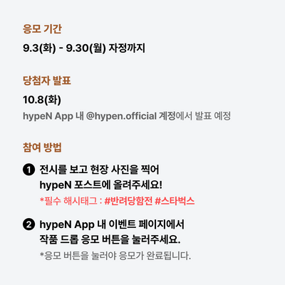๐จ๋ฐ๋ ค๋นํจ์ ์ํ ๋๋กญ ์ด๋ฒคํธ 2์ฐจ ์ ์ ์คํ ๊ธฐ๋ ์ผ๋ก #์์ผ๋๋ #๊น์๋ผ ์๊ฐ๋์ด ์ค๋นํ ์ํ์ 0์์ ๋๋ฆฝ๋๋ค. @islandooo @sorasora_sr ๐์ฐธ์ฌ๋ฐฉ๋ฒ 1. ๋ฐ๋ ค๋นํจ ์ ์ ๋ณด๊ณ ํ์ฅ ์ฌ์ง์ ์ฐ์ด hypeN ํฌ์คํ ์ผ๋ก ์ ๋ก๋ *ํ์ํด์ํ๊ทธ ๊ผญ ๋ฃ๊ธฐ! (#๋ฐ๋ ค๋นํจ์ #์คํ๋ฒ ์ค) 2. hypeN ์ด๋ฒคํธ ํ์ด์ง์์ โ์๋ชจํ๊ธฐโ ๋ฒํผ ํด๋ฆญ ํ ๋ฒ์ด๋ฉด ๋- ์๊ฐ๋์ ํฌ๋ถ๋ค์ ์ด๋ฒ ๊ธฐํ๋ฅผ ๋์น์ง ๋ง์ธ์! ๐ ๐ฉ ์๋ชจ๊ธฐ๊ฐ | 9.3(ํ) - 9.30(์) ์์ ๊น์ง ๐๋น์ฒจ์๋ฐํ | 10.8(ํ) hypeN App ๋ด hypen.official ๊ณ์ ์์ ๋ฐํ ์์ โ ์ ์์ฌํญ์ ๊ผญ ํ์ธํด์ฃผ์ธ์! -๋ณธ ์ด๋ฒคํธ๋ hypeN ๋ด์์ ์ฐธ์ฌ๊ฐ ๊ฐ๋ฅํฉ๋๋ค. -์๋ชจ์ ๋์์ hypeN์ ์๊ฐ ๊ณ์ ์ ํ๋ก์ฐํฉ๋๋ค. -hypeN App ๋ง์ผํ ํ์ฉ ๋์ ๋ฐ ํด๋ํฐ ์ธ์ฆ ์๋ฃ๋ ๋ถ์ ํํ์ฌ ์ด๋ฒคํธ ์ฐธ์ฌ๊ฐ ์๋ฃ๋ฉ๋๋ค.