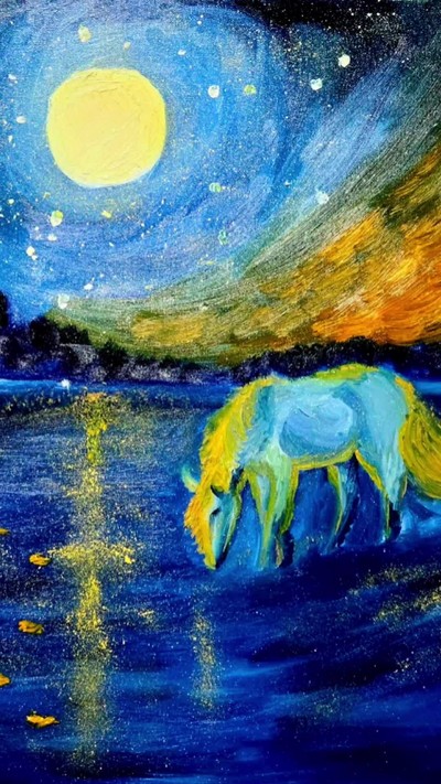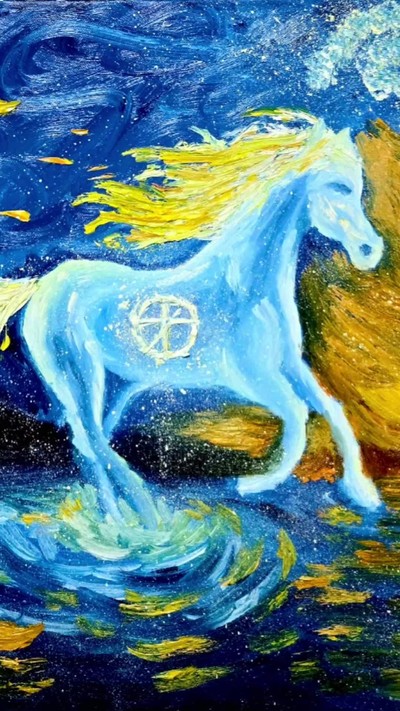 작품명: 이행 황혼의 호수 위를 달리는 말은 상처와 불안 속에서도 빛을 향해 나아가려는 존재를 상징한다. 말의 몸에 흐르는 별빛과 가슴에 새겨진 나침반은 흔들리는 감정 속에서도 자신의 방향을 잃지 않으려는 의지를 드러낸다. 푸른 하늘과 주황빛 노을이 맞닿는 경계는 불안과 희망이 공존하는 순간이며, 위로를 받아들인 뒤 다시 앞으로 나아가려는 내면의 에너지를 보여준다. 이 작품은 어둠을 지나 다시 세상으로 뛰어드는 ‘변화의 용기’를 담고 있다.
