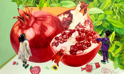 상처 ↔ 알맹이, oil on canvas, 112.1x145.5cm, 2021 sold 과일이 씨앗부터 열매를 맺기까지의 단계가 사람이 아동기, 청소년기를 지나 성인이 되는 과정과 닮아있다고 생각한다. 그림 속 싱그럽게 잘 익은 과일은 여러 삶의 단계를 지나 성장한 우리의 모습이며, 우리의 삶 또한 단단하고 알차길 바라는 마음을 전하고 있다. 그림에는 온전한 과일과 아이들, 그리고 알록달록한 색 면, 선 드로잉이 함께 어우러져 있다. 유아틱한 드로잉 표현은 아이들의 직관적이고 자유분방한 표현에서 빌려왔으며 숙련되지 않은 왼손을 사용하여 나타내었다. 대조적인 그림 속 크고 알찬 과일과, 유아풍의 드로잉은 이미 어른이 되었지만 아직 남아있는 우리들의 미숙함, 천진함 그리고 성장과정을 함께 드러내고자 하였다. 그림 속 아이들은 아이 그자체 이면서도 어린시기를 지나 성장한 우리의 내면, 동심의 모습으로도 볼 수 있다. 우리를 과일이라고 가정해 보자. 앞으로 경험할 다양한 순간 속에서 우리는 스스로에게 물을 주고 햇볕을 쬐어주며 더욱 단단한 나무를, 그리고 알찬 열매를 맺을 수 있기를 희망한다.