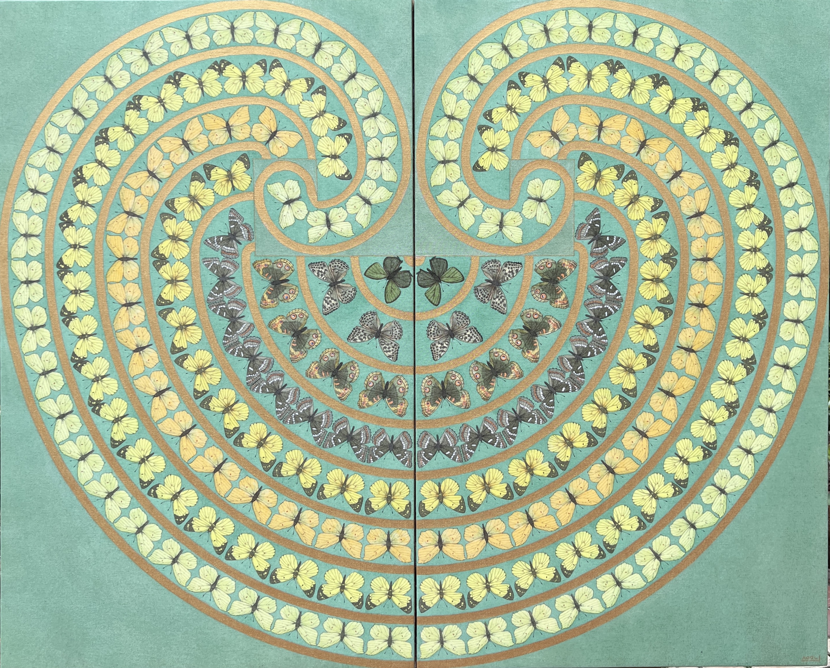 저는 나비, 토성, 그리고 성경에서 영감을 찾는 작가입니다. 저의 작업은 Hand in hand series, To Saturn series, The Bible series의 3가지 테마를 지니고 있습니다. 재료와 기법은 광목천에 한국화물감과 먹, 과슈를 사용합니다.